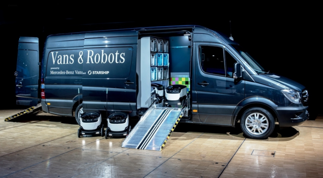 Теперь дело дошло до постройки предсерийного экземпляра. В качестве основы выступил обычный Mercedes-Benz Sprinter, в котором помимо грузового отсека есть отделение для восьми колёсных роботов — последним предстоит самостоятельно покидать машину и заниматься доставкой.